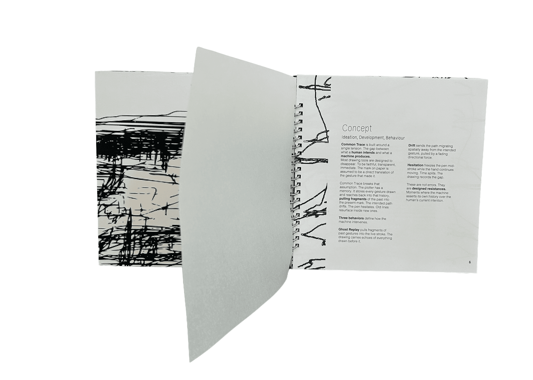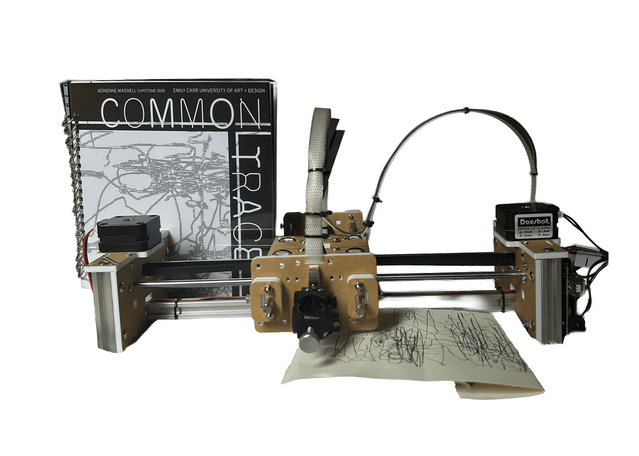 Common Trace is an interactive plotter drawing system that routes trackpad gesture input through an interference engine before sending G-code to a GRBL-based AX5 plotter. The system investigates authorship, memory, and human-machine mark-making through three behaviors: Ghost Replay, Drift, and Hesitation.